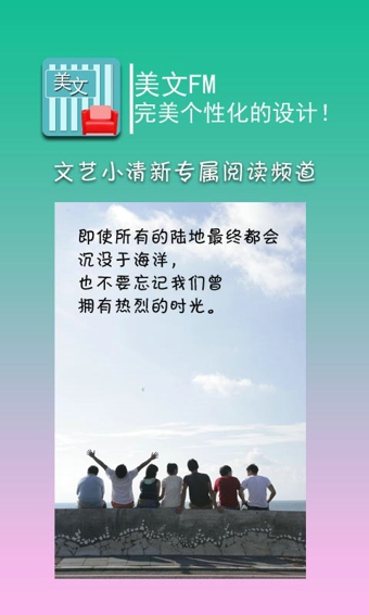 美文FM是一款完全免費(fèi)的個(gè)性化美文閱讀軟件。擁有全新且衷于用戶(hù)體驗(yàn)的界面設(shè)計(jì),集閱讀、評(píng)論、分享等眾多功能于一身,具有小巧精致、操作簡(jiǎn)捷、功能強(qiáng)大的特點(diǎn)。