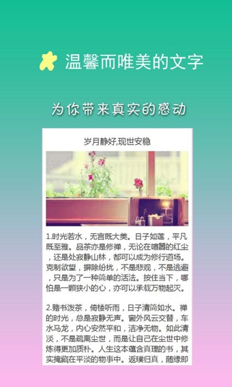 靜靜的夜里用心感受文字的魅力,文藝小清新專(zhuān)屬美文閱讀工具。提供溫暖而又唯美的文章,觸碰心底最柔軟的部位,帶來(lái)最真的感動(dòng)。