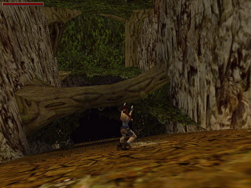第一個(gè):就在游戲開始時(shí)LARA左前方的大石頭下面。先跳到右邊綠色平臺(tái)上再朝著大石頭底部的方向跳。里面可是一把SHORTGUN哦!游戲前期超牛,2槍打死一只老虎。