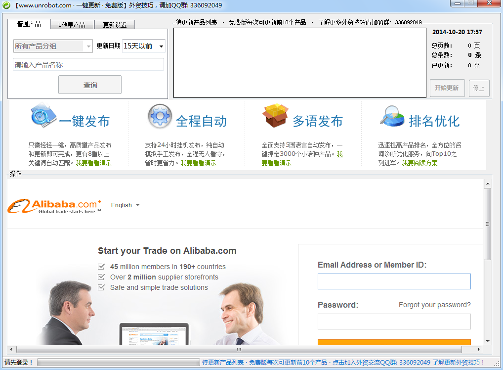 阿里巴巴更新助手是由阿里巴巴推出的一款產(chǎn)品更新工具,這款工具可以幫助用戶將賬戶里的普通產(chǎn)品,以及0效果的產(chǎn)品進行自動更新、重發(fā),使你可以更輕松地對賬戶中的產(chǎn)品進行整理、操作,讓產(chǎn)品更新可以一鍵完成,不再麻煩。