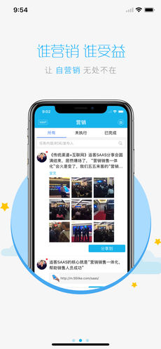 追客app是上海五五來客科技股份有限公司的移動(dòng)營(yíng)銷產(chǎn)品,是一款致力于“幫助企業(yè)實(shí)現(xiàn)全員營(yíng)銷”的SAAS工具,通過手機(jī)版宣傳冊(cè)、營(yíng)銷任務(wù)分發(fā)、自營(yíng)銷管理、營(yíng)銷成果管理、營(yíng)銷排行榜等功能模塊,集多平臺(tái)于一體的全網(wǎng)系統(tǒng)。追客app是全球第一款以“讓銷售無處不在”為指導(dǎo)思想,以“移動(dòng)營(yíng)銷”為方法,提升銷售業(yè)績(jī)的工具,通過營(yíng)銷工具輔助、員工營(yíng)銷積極性調(diào)動(dòng),以及客戶拓展方式優(yōu)化,來幫助企業(yè)最終達(dá)到提升銷售業(yè)績(jī)的目的。