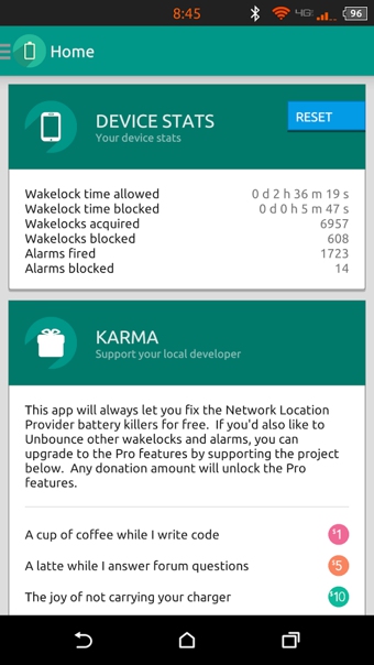 喚醒控制Unbounce讓您能控制您的設備多久喚醒一次及每次保持喚醒多長時間,從而控制您設備對電池的使用。使用推薦設置來簡單地保存電量,或者深挖和自定義每一項喚醒和喚醒鎖設置。 祝您的電池能夠使用更長的時間!【軟件特點】