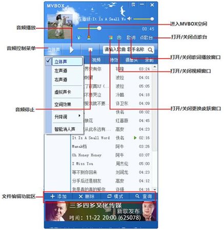 mvbox5.0官方下載2013擁有小巧精致、操作簡(jiǎn)捷、不占資源、功能強(qiáng)大的特點(diǎn)。該軟件具有最新、最快、最全的高音質(zhì)流行歌曲和豐富的網(wǎng)絡(luò)原創(chuàng)歌曲KTV資源;同時(shí),強(qiáng)大的虛擬視頻功能、清晰的視頻捕獲功能、高保真的錄音錄像功能讓mvbox深得用戶喜愛(ài)。