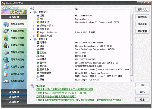 從系統(tǒng)信息檢測(cè)到調(diào)校、從系統(tǒng)清理到維護(hù),Windows優(yōu)化大師都為您提供比較全面的解決方案。Windows優(yōu)化大師同時(shí)適用于Windows98/Me/XP/2000/2003/Vista操作系統(tǒng),提供了全面有效、簡(jiǎn)便安全的:系統(tǒng)檢測(cè);系統(tǒng)清理;系統(tǒng)維護(hù);系統(tǒng)優(yōu)化等功能,讓您的電腦始終保持在最佳狀態(tài)。