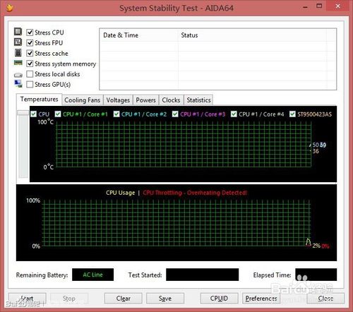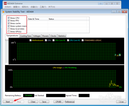 在aida64電腦拷機的系統(tǒng)穩(wěn)定性測試中我們根據需要在左上角選擇要檢測的功能,默認是前四個,選好以后我們點擊左下角的Start也就是開始。