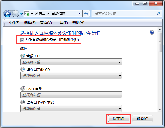 點擊電腦的 開始 >> 控制面板 >> 自動播放,勾選 為所有媒體和設(shè)備使用自動播放(U),點擊 保存,如下:
