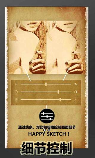 1、左右方向按鈕可以切換12種不同的風(fēng)格:鉛筆素描、懷舊素描、時(shí)光機(jī)、鉛筆淡彩。2、另有多種紙張風(fēng)格可選,配合不同的素描風(fēng)格,精彩浮現(xiàn)指端!