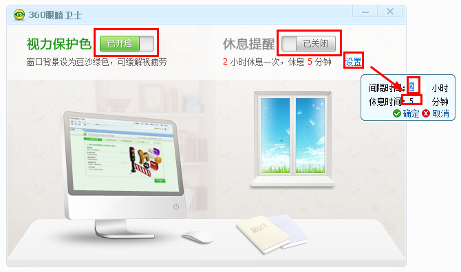 3、左邊是視力保護(hù)色開關(guān),右邊是休息提醒可以自動設(shè)置休息的時間間隔,簡單明了。