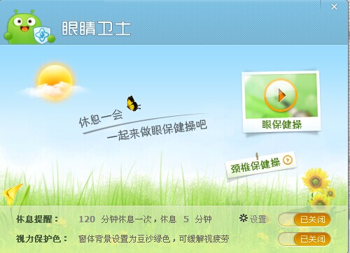 眼睛是我們看世界的窗口,沒有了眼睛,我們就無法感受光明。所以,維持一個健康的視力水平是很有必要的。但對于成天對著電腦的上班族,以及將玩電腦游戲?yàn)橹饕獖蕵返男∨笥褌儊碚f,用眼過度幾乎是通病,在工作學(xué)習(xí)壓力之下,保護(hù)眼睛似乎成了奢望。360眼睛衛(wèi)士是上班族們保護(hù)視力的最佳助手,主要作用就是定時提醒你休息,讓你的眼睛不再處于長久的疲勞狀態(tài)。軟件的使用方法也超級簡單哦,只要點(diǎn)開啟就可以啟動護(hù)眼軟件,開啟后窗口背景就會設(shè)置成豆沙綠色,可以緩解眼睛疲勞,同時還會有貼心的休息提醒,提醒時間可以自已設(shè)置。360眼睛衛(wèi)士,合理作息,健康生活,智能健康提示,定時提醒,健康生活伴您每一天。