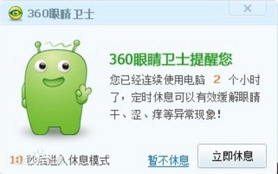 5、當(dāng)?shù)搅嗽O(shè)定的休息時間,360眼睛衛(wèi)士的安仔會自動彈出讓你休息,當(dāng)然,如果手頭真的有非常必要的事情可以選擇暫不休息。當(dāng)點(diǎn)擊立刻休息,則會跳出一款Q版眼睛保健操演示圖,可謂讓人重溫了兒時的記憶,每天課間那清脆的聲音:“眼保健操,現(xiàn)在~開始~~第一節(jié),按揉睛明穴”……