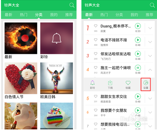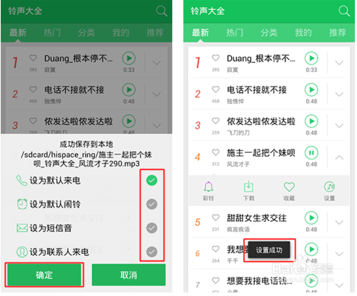 從收藏夾里設(shè)置鈴聲,和以上步驟相同,但設(shè)置為鈴聲后,會(huì)默認(rèn)下載鈴聲到本地。