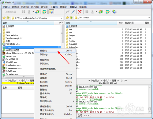 現(xiàn)在要上傳文件到服務(wù)器上,也就是把左側(cè)的文件傳到右側(cè)中。在左側(cè)目錄中找到要上傳的文件。右擊鼠標(biāo)選擇第一項【傳輸】