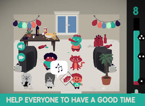 游戲中有各種各樣的角色設(shè)定,諸如“打扮干凈的怪物”、“愛(ài)喝酒的長(zhǎng)頸鹿”、“愛(ài)好音樂(lè)的外星人”,甚至“奇葩的人類”等。而舉辦派對(duì)的地方也是相當(dāng)另類,時(shí)而在外太空,時(shí)而在神秘森林,時(shí)而在某一間房間里。其中,每個(gè)成員都會(huì)用“對(duì)話泡泡”的形式告訴你他們想要的東西?;蛘呤窍胍玫近S金條的、想要一只貓的,又或者是想要得到一個(gè)吉他,幻想自己演奏樂(lè)曲等。而你需要做好主人翁的職責(zé),滿足他們的所有要求,在一個(gè)“派對(duì)”格子中,將它們重新排列好。