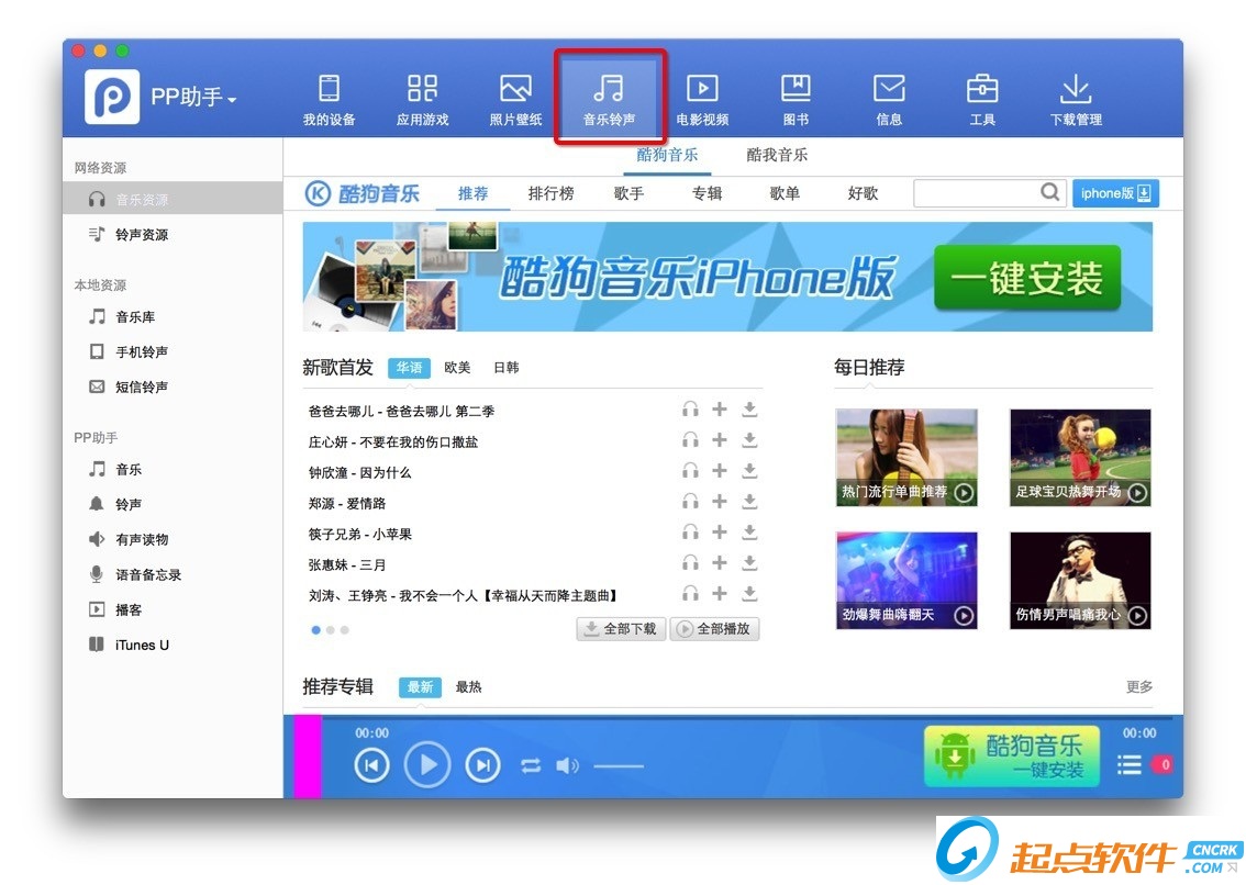 全新的多媒體模塊,支持音樂/鈴聲下載和導入,點擊PP助手上的【 音樂鈴聲】即可快速搜索您想要任何