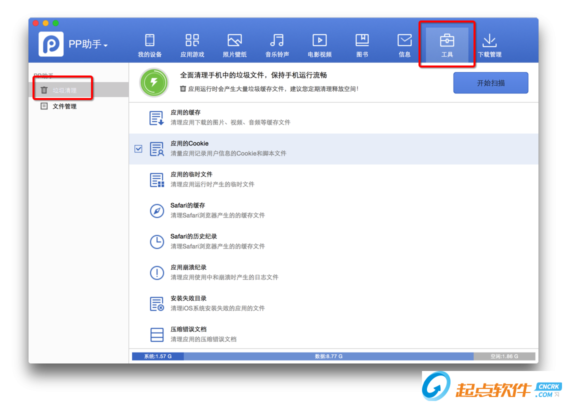 垃圾清理功能:點擊PP助手上的【工具】-【垃圾清理】,即可對手機上的緩存文件及垃圾文件進行清理喔: