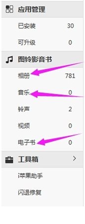 3、左邊是設(shè)備中的相片,音樂,電子書等功能。