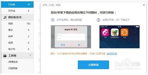 1、將手機(jī)與電腦連接,打開i蘋果電腦版中“我的手機(jī)”頁面,選擇左側(cè)目錄中的“閃退修復(fù)”選項,即可針對上述兩種情況進(jìn)行閃退修復(fù)。