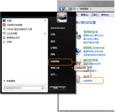 【步驟一】:在我的電腦開始菜單中打開控制面板,找到卸載程序入口