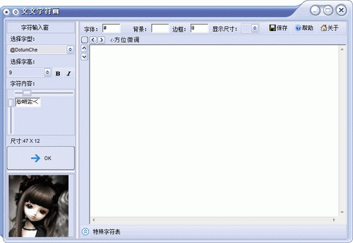本軟件用于制作由很多字符或者文字組成大文字效果的工具,用于QQ,MSN,BBS簽名等地方。本軟件為綠色軟件,無需安裝、不帶插件、免費注冊、界面友好簡單、使用方便