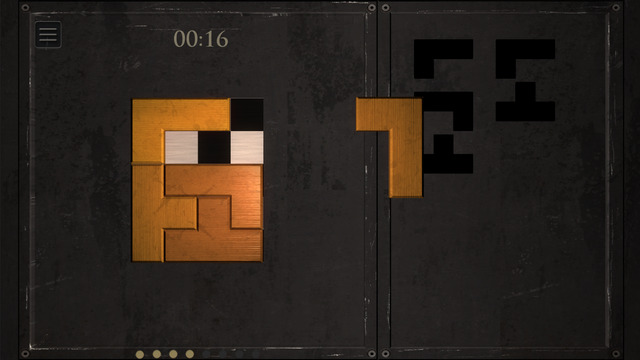 整個(gè)游戲畫(huà)面簡(jiǎn)單利落,非常的質(zhì)樸,背景顏色非常的暗給玩家制造了一個(gè)相對(duì)寧?kù)o的空間與環(huán)境,左邊放置的是一個(gè)國(guó)際象棋式樣的棋盤(pán),右邊則放置著該關(guān)卡所需要的各種形狀的俄羅斯方塊,僅用一種比較普通的顏色進(jìn)行顯示,倒是給人的質(zhì)感很不錯(cuò)。只有放置方塊時(shí)所發(fā)出清脆的聲響,沒(méi)有任何的音樂(lè),在這種環(huán)境下可以令人更靜心地進(jìn)行游戲。游戲的特色在于玩法相當(dāng)?shù)慕?jīng)典,需要玩家對(duì)方塊的變化和組合相當(dāng)?shù)氖煜?,同時(shí)對(duì)棋盤(pán)的空間感有著了解,游戲開(kāi)始后畫(huà)面中的左右兩邊分別出現(xiàn)一個(gè)國(guó)際象棋的棋盤(pán)和數(shù)塊俄羅斯方塊,玩家的任務(wù)是需要在這個(gè)棋盤(pán)中放置各種俄羅斯方塊將其將其嵌滿,而右邊將會(huì)提供數(shù)塊各種形狀的俄羅斯方塊,這些俄羅斯方塊一定是和棋盤(pán)的大小、格子數(shù)量、位置是完全吻合的,玩家的目標(biāo)就是將俄羅斯方塊逐個(gè)的組合起來(lái),無(wú)論是大小與形狀完全吻合棋盤(pán),并將其完全對(duì)稱的放入棋盤(pán)中。