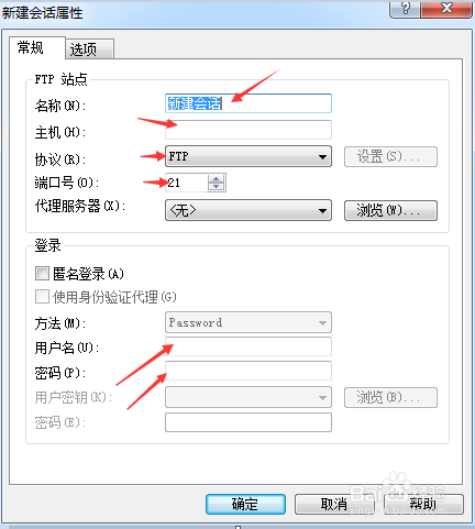 2、在“新建會話屬性”中選擇“名稱”為主機命名,在“主機”欄輸入主機IP,“協(xié)議”和“端口號”使用默認ftp和21,在“用戶名”和“密碼“欄輸入賬戶密碼。點擊確定。