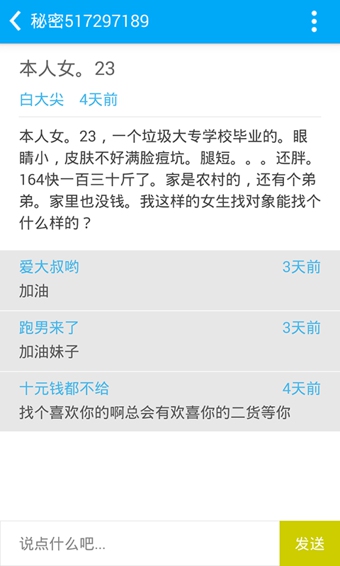 聊大大,是一個(gè)你可以?xún)A心發(fā)表自己秘密的APP,不能和家人、朋友、同學(xué)、同事、閨蜜述說(shuō)的秘密,都可以在這里發(fā)表。聊大大,是一個(gè)滿足你好奇心的APP,閱讀、評(píng)論他人的秘密,是不是很有意思呢,頓時(shí)覺(jué)得世界無(wú)奇不有。
