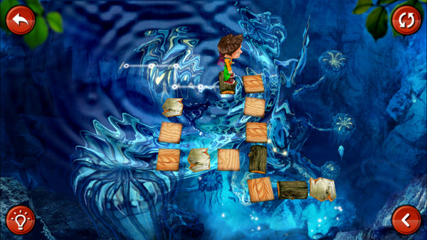 操作上沒什么值得探討的,就是點擊木塊讓泰德一個接一個地跳上去,我們唯一的目的就是要找出合理的路線,保證將所有的木塊逐一踩踏,在移動的方向上我們只能選擇水平和垂直兩種,也就是說,你要按照橫豎的方式行進(jìn),一個不落地將所有木塊踩踏,在路線的設(shè)計上必須費一番心思,而游戲的益智性就體現(xiàn)在這里。