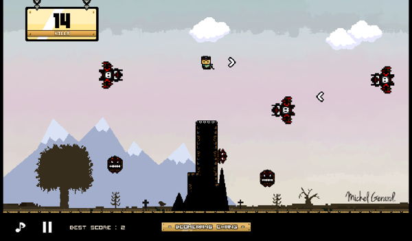 《回力斬殺Boomerang Chang》游戲最初出現(xiàn)在網(wǎng)頁平臺,取得了不錯的成績。因此Michel Gerard便一鼓作氣將其移植到手機平臺,期望能夠得到更好的成績。在游戲當中,玩家將會成為一名叫做[as Chang]的角色,他是個相當可憐的家伙,在數(shù)十年的時間里一直呆在小小忍者山,為了生存而竭盡全力。如今玩家的目標就是幫助他生存下來,順利躲避一大波來襲的敵人。在他陷入疲憊的時候,你將充當他的指揮官,控制他跳躍、丟武器(即回力鏢)、擺脫敵人等等。游戲中制勝的關鍵在于回力鏢,玩家需要深刻把握這種武器的原理,預測回力鏢的威力和方向。比如說,如果你想要襲擊右邊的敵人,那么你要把回力鏢往左邊丟過去,然后再等待飛鏢返回??雌饋硎遣皇窍喈敽唵?但是當你面對一大波可怕的敵人時候,你的冷靜和理智很可能會喪失大半,失去判斷能力。