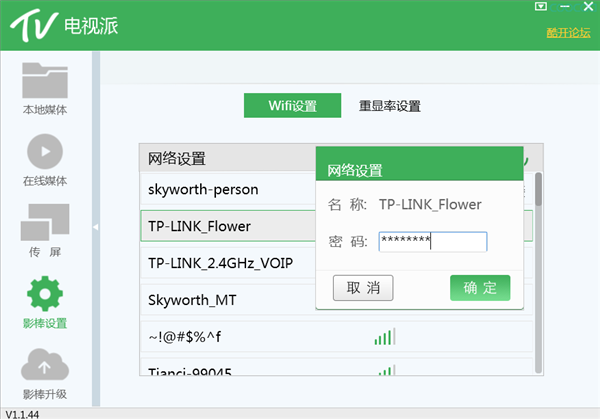 Wifi連接設(shè)置點(diǎn)擊電視派主界面中的"影棒設(shè)置",選擇需要連接的Wi-Fi并輸入相應(yīng)的密碼,為影棒設(shè)置Wi-Fi連接。選擇Wi-Fi列表中已連接的條目,點(diǎn)擊鼠標(biāo)右鍵可以清除已經(jīng)記錄的Wi-Fi密碼或者斷開連接。