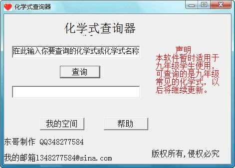 查詢化學式的軟件 暫時收錄了九年級的常用化學式 有雙向查詢功能 詳細情況請參看程序的幫助 2.0版本修正了1.0版本的一些錯誤 并且加入了一些化學式 注意:化學式和化學方程式是不一樣的 本軟件只能查詢化學式