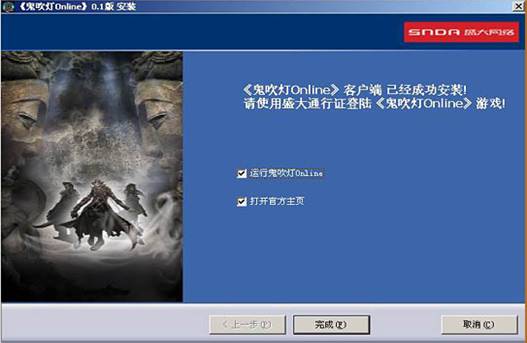 5 、點(diǎn)擊“ 完成”,游戲安裝成功后,會(huì)在桌面自動(dòng)生成《鬼吹燈 外傳 》游戲圖標(biāo), ( 在桌面左下角的 “ 開(kāi)始 ” → “ 程序 ” → “ 盛大網(wǎng)絡(luò) ” → “ 鬼吹燈 外傳 ” 中 ) ,也會(huì)出現(xiàn)游戲圖標(biāo)。