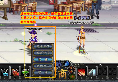 1、點(diǎn)擊需要交易的玩家,鼠標(biāo)右鍵點(diǎn)擊他(她)之后,將會(huì)在目標(biāo)的身邊開(kāi)啟玩家交 互選單