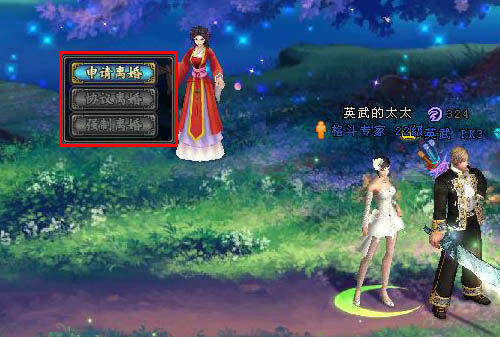 如果兩個(gè)人在一起不開(kāi)心,那么可以前去”緣生湖”找尋NPC—“紅娘”點(diǎn)擊”申請(qǐng)離婚”選項(xiàng),來(lái)進(jìn)行離婚,如圖: