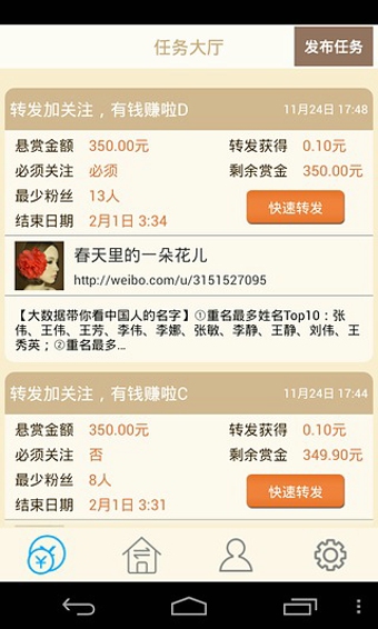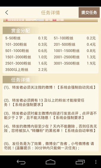 微博互粉大廳是一款微博互粉軟件,可以幫助你的微博粉絲數(shù)得到很明顯的提升,這款軟件與平常的互粉軟件不同,用戶在該軟件中每關(guān)注一個(gè)用戶或者是被其他人關(guān)注,都會(huì)消耗相應(yīng)的體力,但是你可以通過(guò)完成各種系統(tǒng)任務(wù)來(lái)獲取足夠的體力。