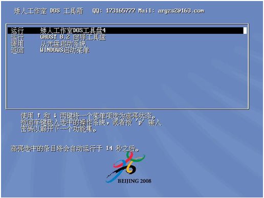 “運(yùn)行 矮人工作室DOS工具盤4”是進(jìn)入DOS選項(xiàng)?!斑\(yùn)行 GHOST8.2向?qū)Чぞ弑P”是進(jìn)行C盤備份與恢復(fù)的選項(xiàng)。