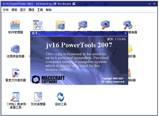 jv16 PowerTools2007 V1.7.0.422 Final 綠色特別版 jv16 PowerTools為您提供對Windows系統(tǒng)的全面管理、控制,可用于注冊表、文件系統(tǒng)和本地網(wǎng)絡的監(jiān)控與優(yōu)化。注冊表工具可以維護Windows添加/刪除軟件列表;卸載軟件;掃描注冊表中的無效鍵值;刪除無效內(nèi)容;控制系統(tǒng)啟動時加載的程序;電腦的注冊表。文件系統(tǒng)工具能搜索本地電腦中的零長度文件、重復文件、臨時文件、無效快捷方式等。設(shè)置好就能加速PC運行,還能從中學到不少東東哦!