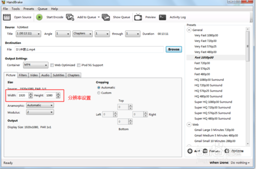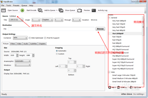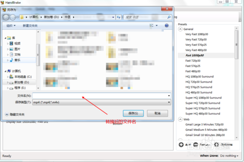 添加源文件,添加后的界面如圖所示,右側(cè)區(qū)域為常用的模式,軟件默認(rèn)為fast1080P30,這個默認(rèn)就好,我們一般不需要更改,添加源文件后選擇Brose按鈕找到文件需要保存的位置后,輸入需要保存的文件名稱,點擊確定即可