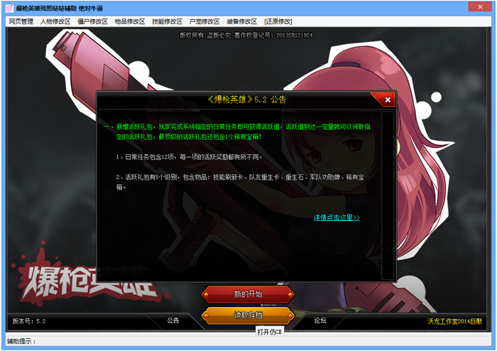 網(wǎng)頁(yè)管理、人物修改區(qū)、僵尸修改區(qū)、物品修改區(qū)、技能修改區(qū)、尸寵修改區(qū)、裝備修改區(qū)、還原修改【使用說(shuō)明】