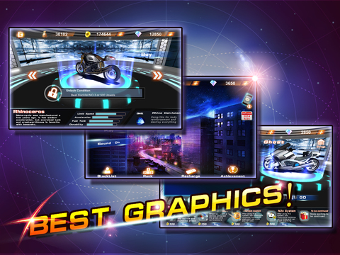 不同風(fēng)格的場景---白天不喜歡?好吧,那就體驗(yàn)一下黃昏和黑夜中飆車的感覺。各種特點(diǎn)摩托---每種摩托都有它獨(dú)特的一面,不同的性能帶給您不同體驗(yàn),帶特技的摩托更能讓您領(lǐng)略極速的快感。
