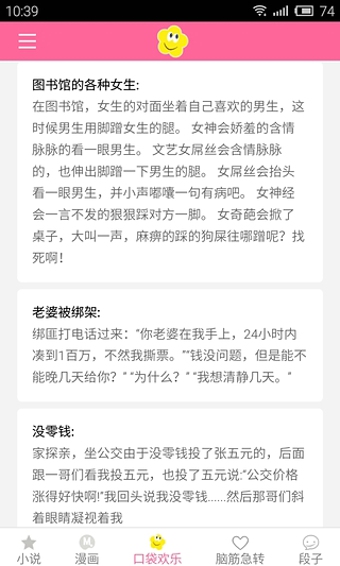 口袋段子,隨時(shí)掏出的歡樂(lè),擁有內(nèi)涵段子、冷笑話、腦筋急轉(zhuǎn)彎、漫畫故事等深度內(nèi)涵欄目,夜幕降臨時(shí)給家里的小朋友來(lái)段漫畫故事、益智寓言;工作休閑下來(lái)時(shí)給自己、家人和朋友來(lái)段腦筋急轉(zhuǎn)彎、冷笑話;內(nèi)涵、深情、搞笑、益智、輕松......無(wú)論何時(shí)何地!【更新日志】