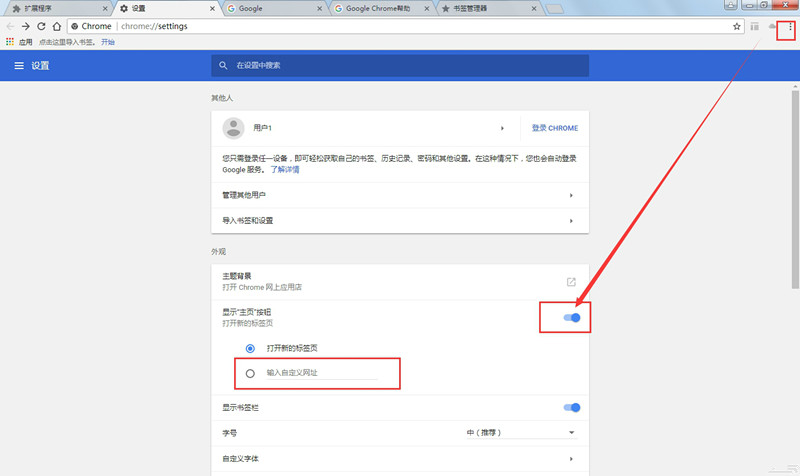 ·在“顯示‘主頁’按鈕”下方,選擇使用新標簽頁或自定義網(wǎng)頁。