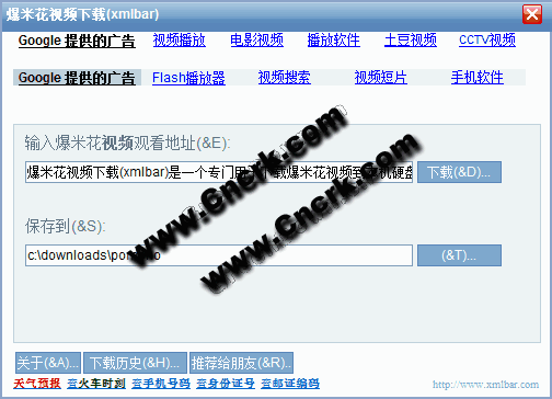 爆米花視頻下載(xmlbar)是一個專門用于下載爆米花視頻到本機硬盤上的小軟件。它不但完全免費而且不含有任何插件,可以完全干凈卸載。用戶只需輸入需要下載的爆米花視頻的觀看頁面地址并按下下載按鈕,或者更方便的使用拖放方法將頁面地址從瀏覽器地址欄拖到本軟件的浮動窗口,它就會自動識別后進行下載,下載的文件格式為flv。更好的是它還支持多個爆米花視頻文件同時下載,并能顯示出真實的爆米花視頻文件的下載地址,下載完后您還可以選擇馬上播放,而且它還有查看管理下載歷史記錄的功能