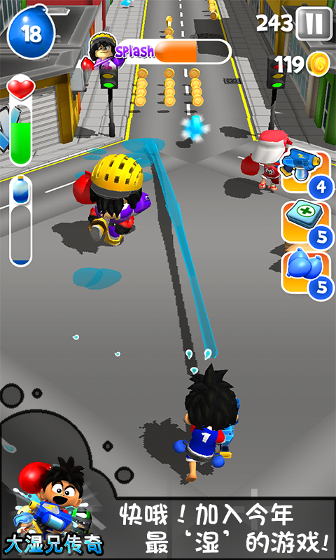 Mike妹妹被欺負了!快來幫Mike和他朋友去找鄰家壞蛋們報仇!還有加農(nóng)水槍,不可以殘忍拒絕哦~ 背起盾牌和水包,扛起你的大水槍,穿越城鎮(zhèn),翻過高樓,來一場任性的街頭大戰(zhàn)!想要提高得分嗎?想沖上排行榜頂端嗎?靠錢和運氣是不行滴,保持奔跑才是王道!