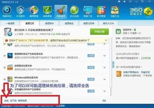 如果長(zhǎng)期沒(méi)有對(duì)系統(tǒng)進(jìn)行垃圾清理,那么在C盤(pán)會(huì)產(chǎn)生各類(lèi)垃圾文件,此類(lèi)文章會(huì)占用大量C盤(pán)空間,這種情況我們建議大家使用360安全衛(wèi)士或者金山衛(wèi)士對(duì)系統(tǒng)垃圾進(jìn)行清理,這里建議大家在使用清理工具為了可以盡可能清理掉系統(tǒng)垃圾,請(qǐng)選擇全選。