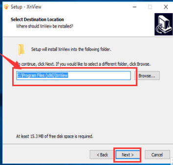 3、接下來(lái)的步驟中是讓我們選擇一個(gè)xnview被安裝到哪個(gè)磁盤(pán)下的某個(gè)目錄,點(diǎn)擊Browse進(jìn)行選擇,大家這個(gè)要自己來(lái)選擇。然后點(diǎn)擊“Next”。