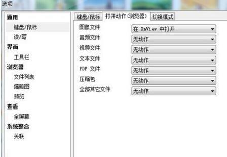 4.在“打開(kāi)動(dòng)作”選項(xiàng)卡中,默認(rèn)的xnview關(guān)聯(lián)著視頻、音頻、txt等等文件,這些完全沒(méi)必要,所以都選擇無(wú)動(dòng)作。