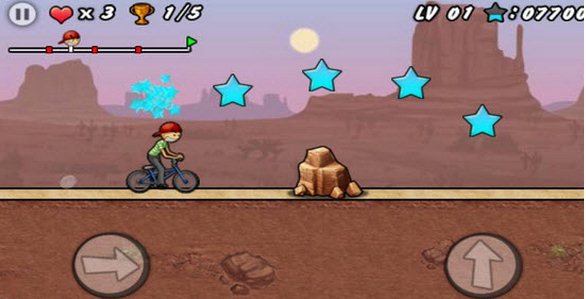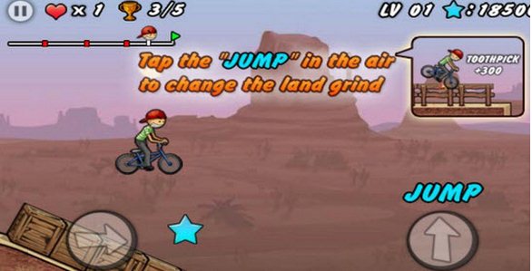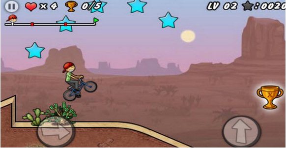 跑酷自行車2是一款以跳躍與躲避行駛的跑酷游戲!玩家需要控制自行車酷男以靈活動(dòng)作躲過障礙物!吃掉中途出現(xiàn)的輔助寶貝會(huì)增加能量!控制單車行進(jìn)只要按屏幕的提示點(diǎn)擊即可實(shí)現(xiàn)!游戲途中可以加速度和跳躍!加速越快跳躍越高!動(dòng)作越炫酷!可愛的農(nóng)場背景與復(fù)雜的山地背景都能給人一種放松的心態(tài)!游戲內(nèi)的難度會(huì)隨著關(guān)卡的加深而加難!使游戲更具挑戰(zhàn)性!展現(xiàn)酷男風(fēng)采!亮出你絢麗的技巧!這就是跑酷自行車2的追求,帥呆!酷斃!重重關(guān)卡!各種絢麗的技巧!讓你體驗(yàn)跑酷自行車2的無限樂趣!【游戲特色】