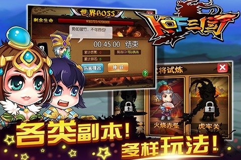 玩家在三國的眾多武將之中自由選擇三人組成隊伍,征戰(zhàn)天下,挑戰(zhàn)BOSS。獨一無二的KOF 戰(zhàn)斗系統(tǒng),借助街機游戲拳皇97的戰(zhàn)斗模式,三國的故事背景,獨創(chuàng)了連續(xù)技系統(tǒng),區(qū)別普通的回合制游戲的技能釋放邏輯。實現(xiàn)配置多技能,浮空連續(xù)技,47種技能效果,26種戰(zhàn)斗buff。通過技能與武將之間的搭配形成策略玩法。