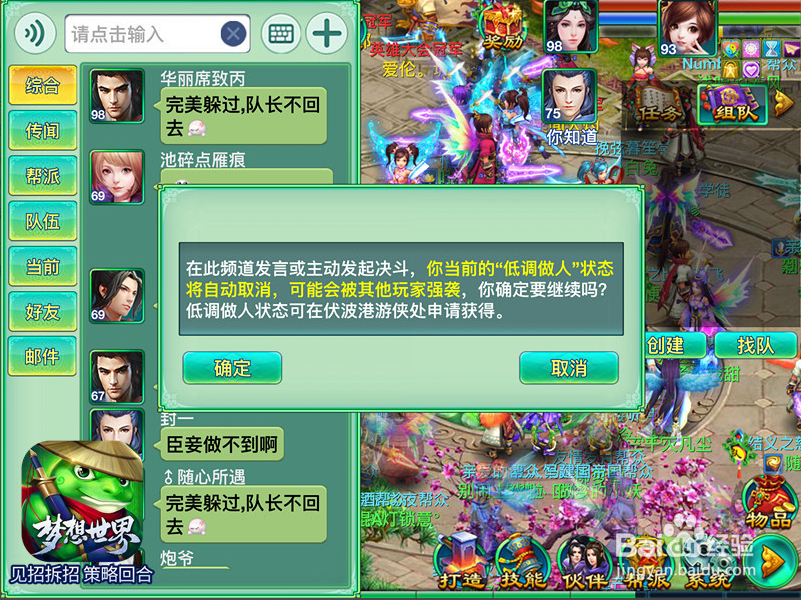 低調(diào)做人在這個(gè)紛爭(zhēng)的江湖中,若想獲得屬于自己的一片寧?kù)o,同樣可以到伏波港(163,73)找到“游俠”,只要在24小時(shí)內(nèi)未主動(dòng)發(fā)起游俠戰(zhàn)斗,即可申請(qǐng)獲取“低調(diào)做人”的狀態(tài),該狀態(tài)下不會(huì)進(jìn)入游俠戰(zhàn)斗,但同時(shí)也不能在綜合與世界頻道發(fā)言及主動(dòng)發(fā)起游俠戰(zhàn)斗。