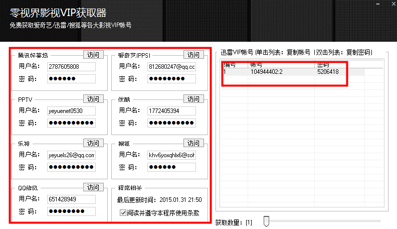 影視VIP獲取器是零視界出品的全新全能型VIP會(huì)員獲取工具。該工具可以幫助用戶獲取愛(ài)奇藝、騰訊好萊塢、搜狐視頻、迅雷、樂(lè)事、優(yōu)酷等視頻網(wǎng)站的VIP賬號(hào),它占用資源小,播放還無(wú)廣告,還用戶一個(gè)純潔的視頻播放環(huán)境。